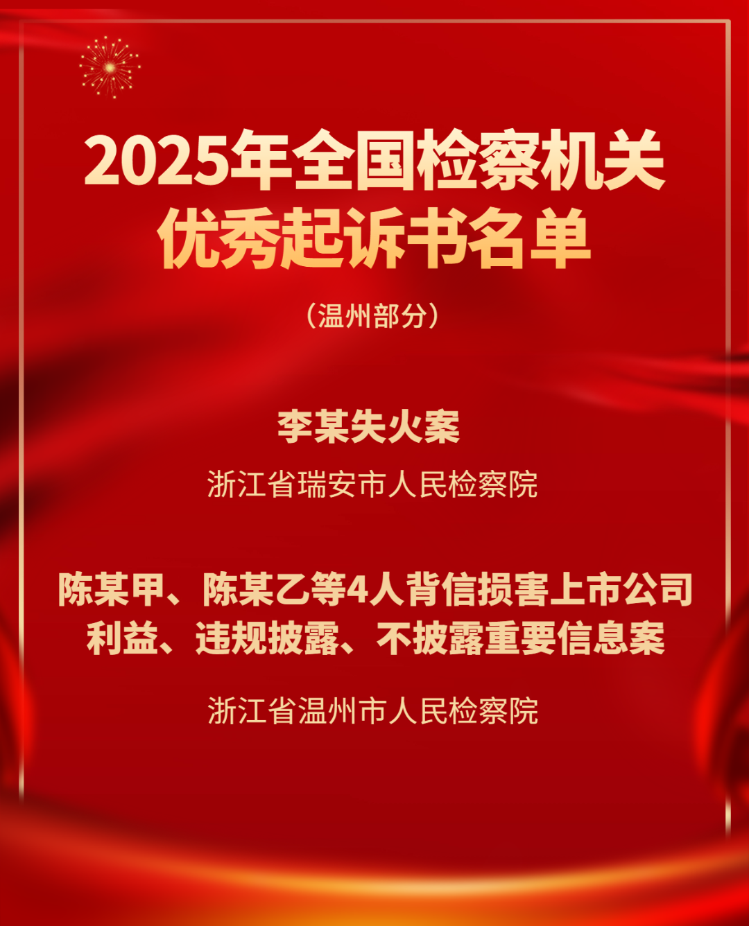 2025年5月,由最高人民检察院职务犯罪检察厅牵头,普通犯罪检察厅、重大犯罪检察厅、经济犯罪检察厅、未成年人检察厅共同参与,部署举办了全国检察机关优秀起诉书评选活动。经过初评、复评、审定三个主要环节,评选出100篇优秀起诉书和20篇优秀起诉书提名。其中,瑞安市检察院办理的“李某失火案”和温州市检察院办理的“陈某甲、陈某乙等4人背信损害上市公司利益、违规披露、不披露重要信息案”起诉书获评全国检察机关优秀起诉书。