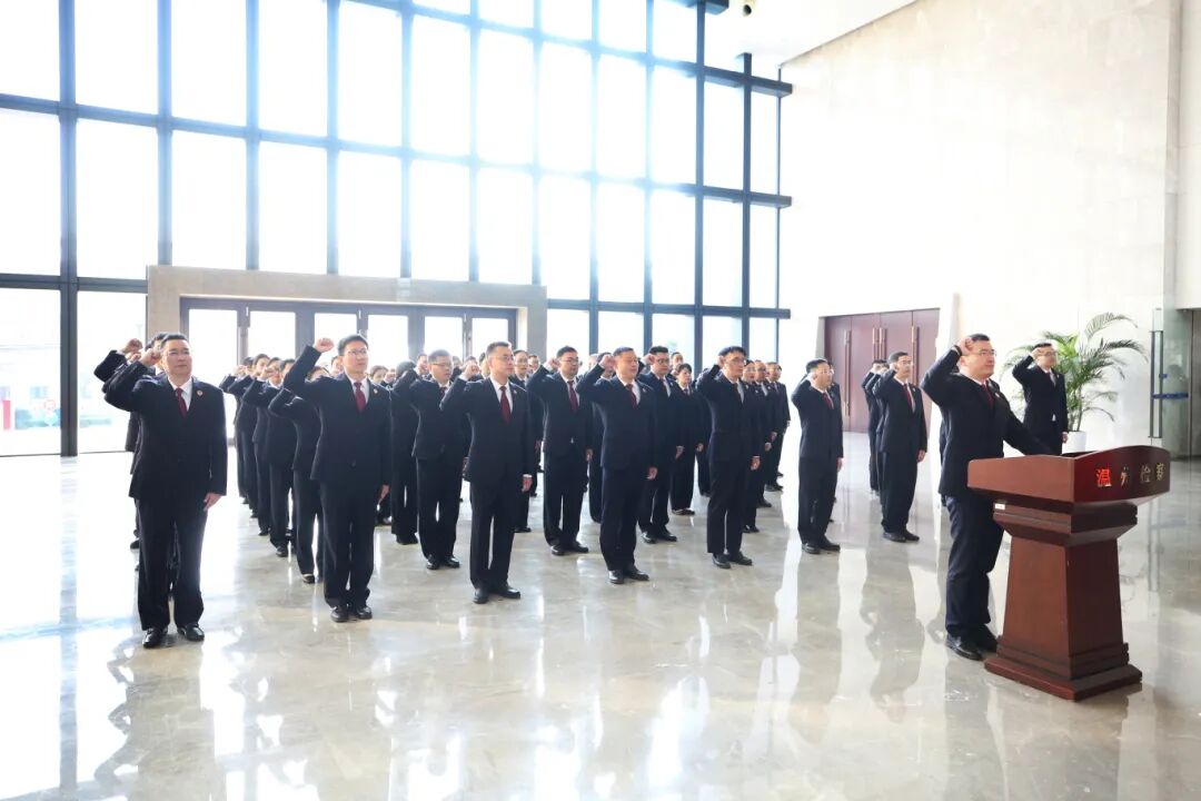 上午8:40,温州市检察院二楼大厅,在院党组副书记、常务副检察长王盛的监誓下,院党组成员、政治部主任何哲宇担任领誓人,60名员额检察官与近期新选拔提任、新职级晋升、新任法律职务、新录用遴选人员参与宣誓。