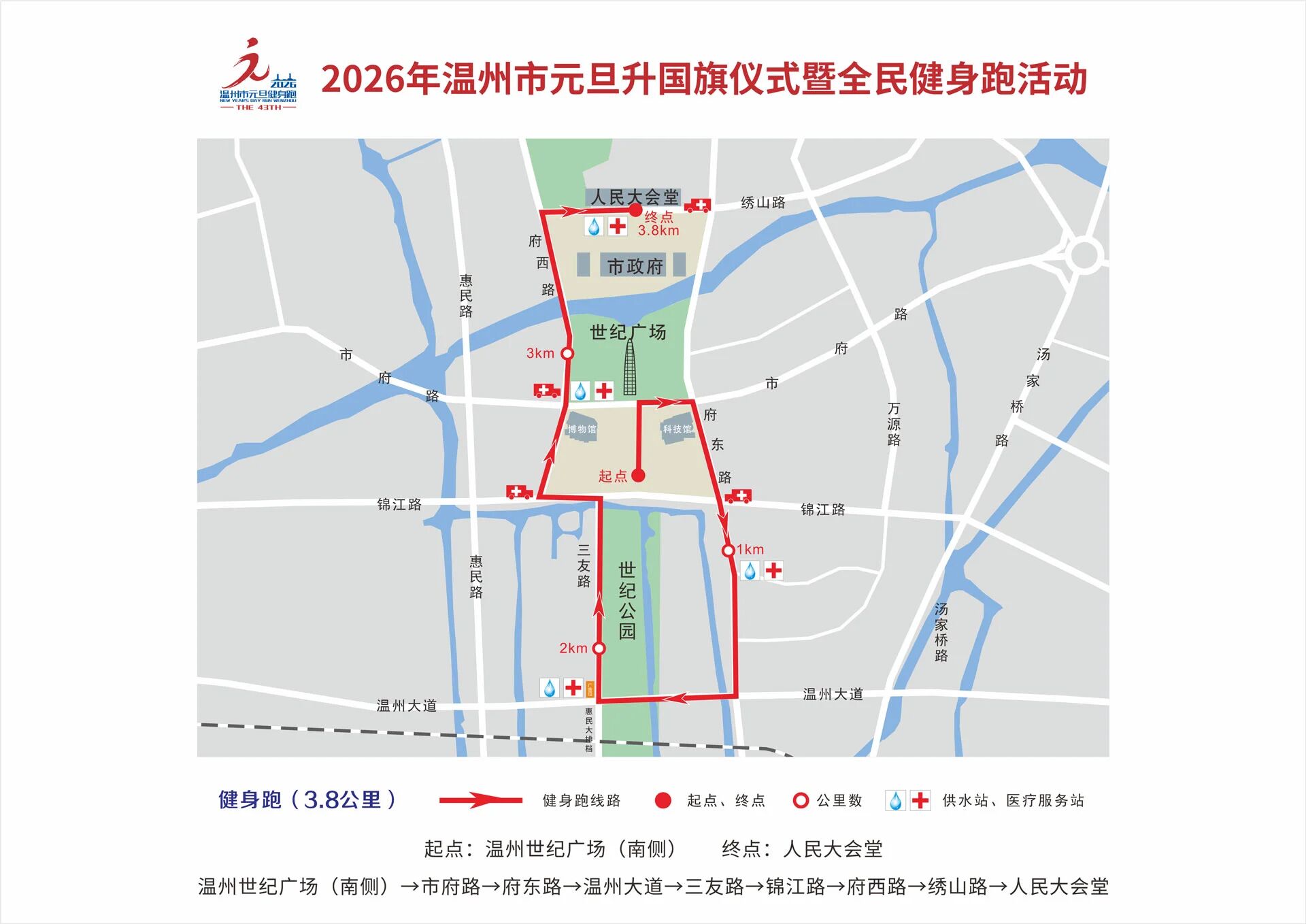 本次健身跑路线全程约3800米,从世纪广场南广场出发,经市府路—府东路—温州大道—三友路—锦江路—府西路,最终抵达绣山路人民大会堂前。